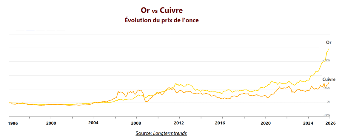Pourtant, à fin 2025, le prix du cuivre a atteint un niveau historique! Le graphique qui suit illustre l’évolution des prix de l’or et du cuivre depuis la fin des années ’90: