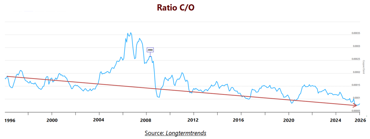 Le ratio Cuivre/Or (C/O) est égal au prix d’une once de cuivre divisé par le prix d’une once d’or.