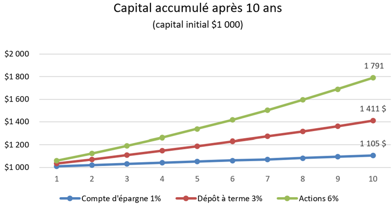 Constat : après 10 ans, le rendement du panier d’actions est près du double du rendement du dépôt à terme et plus de sept (7) fois le rendement du compte d’épargne.